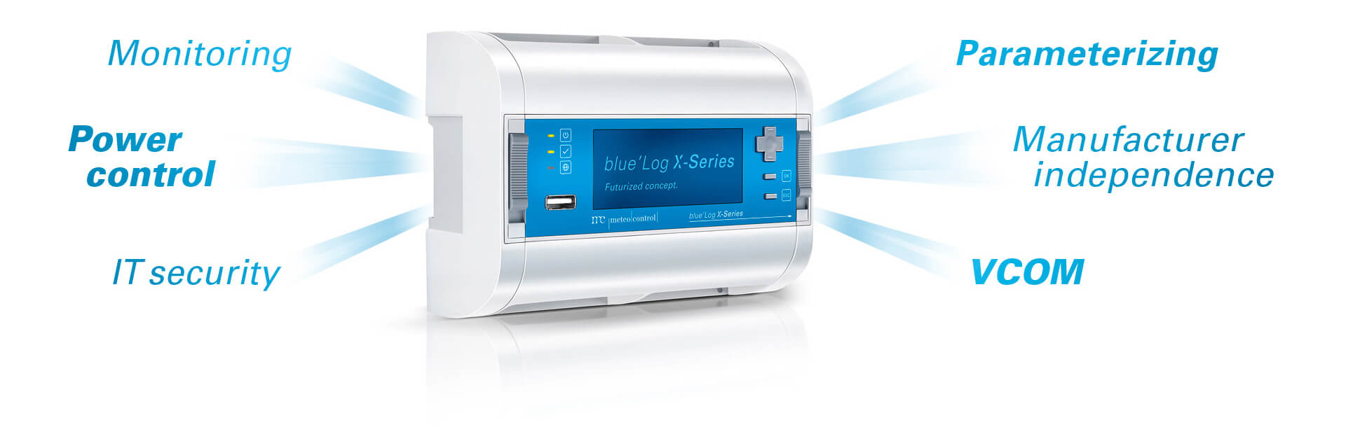 La blue’Log X-Series enregistre toutes les données de votre installation photovoltaïque et représente l’interface pour l’intégration réseau. La blue’Log X-Series constitue en outre les composants clés sur site du portail de monitoring VCOM (poste de contrôle virtuel) à des fins de surveillance.