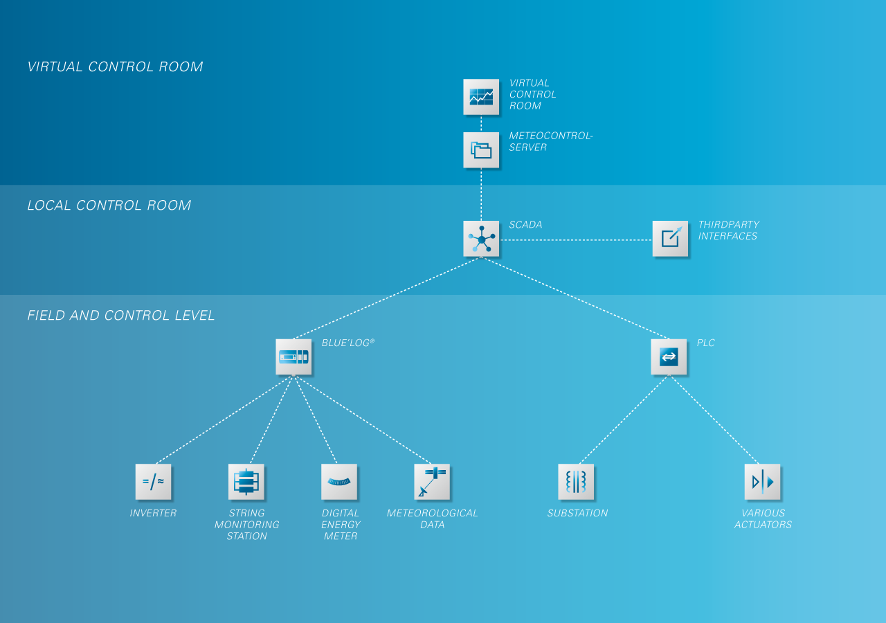 Le centre SCADA est tout indiqué pour la gestion d’exploitation locale comme globale de votre centrale solaire. La compatibilité directe avec les enregistreurs de données de la série blue’Log X permet de collecter les données les plus diverses sur l’installation et de les afficher sur place via l’interface utilisateur du centre SCADA. Les différents paramètres de l’installation se laissent également régler via diverses interfaces.