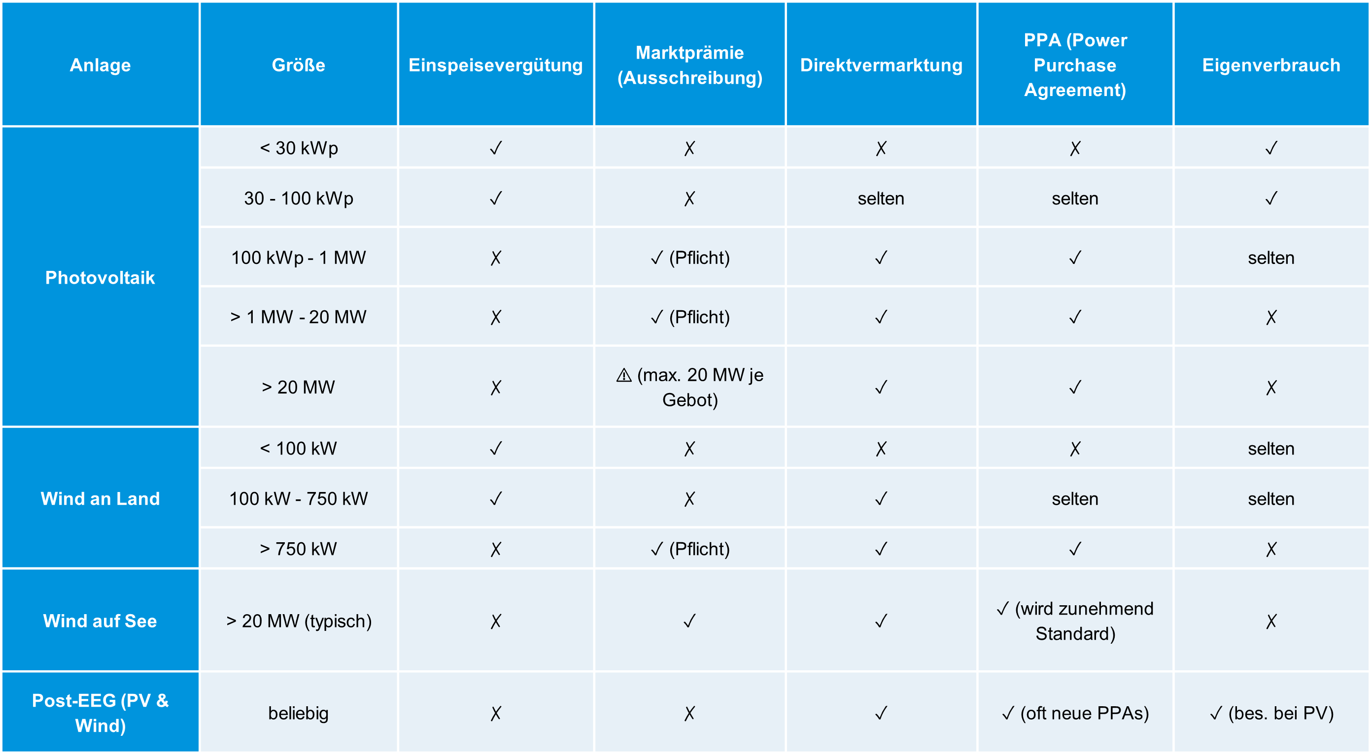 Bei Post-EEG-Anlagen sind PPAs meist erst ab einer Größe von mindestens 1 MW wirtschaftlich sinnvoll. Für Post-EEG-Anlagen zwischen 100 kWp bis 1 MW ist überwiegend die Direktvermarktung die bessere Lösung, da sie einfacher ist und Standardlösungen am Markt verfügbar sind.