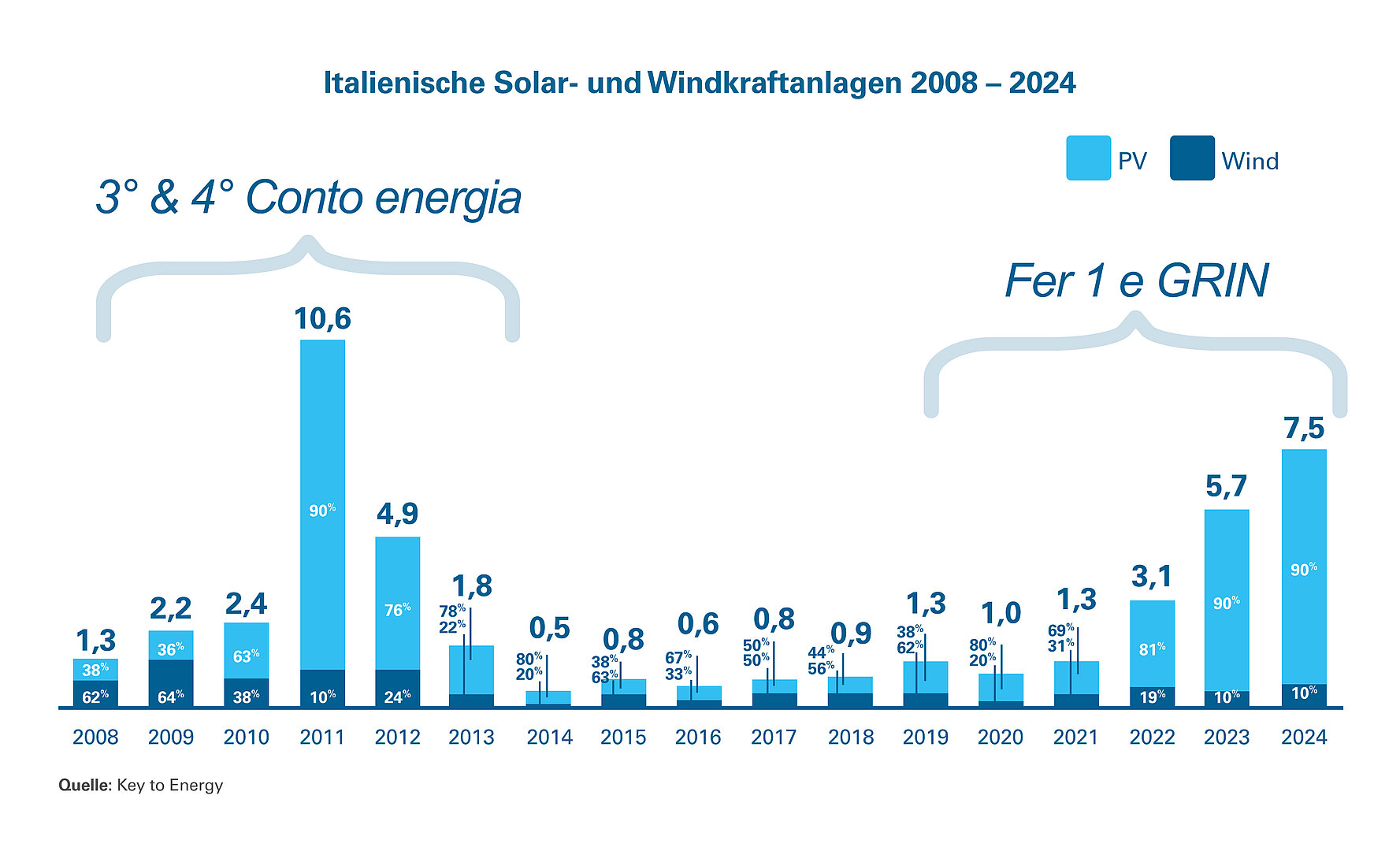 Während abrupte politische Kurswechsel den italienischen Markt in der Vergangenheit gestört haben, ist Italien dank der Kombination aus staatlichen Ausbauzielen und Projektversteigerungsprogrammen für Solar-, Wind- und Batterietechnologie heute gut positioniert, um ab 2025 eine Phase starken und nachhaltigen Wachstums zu erleben.