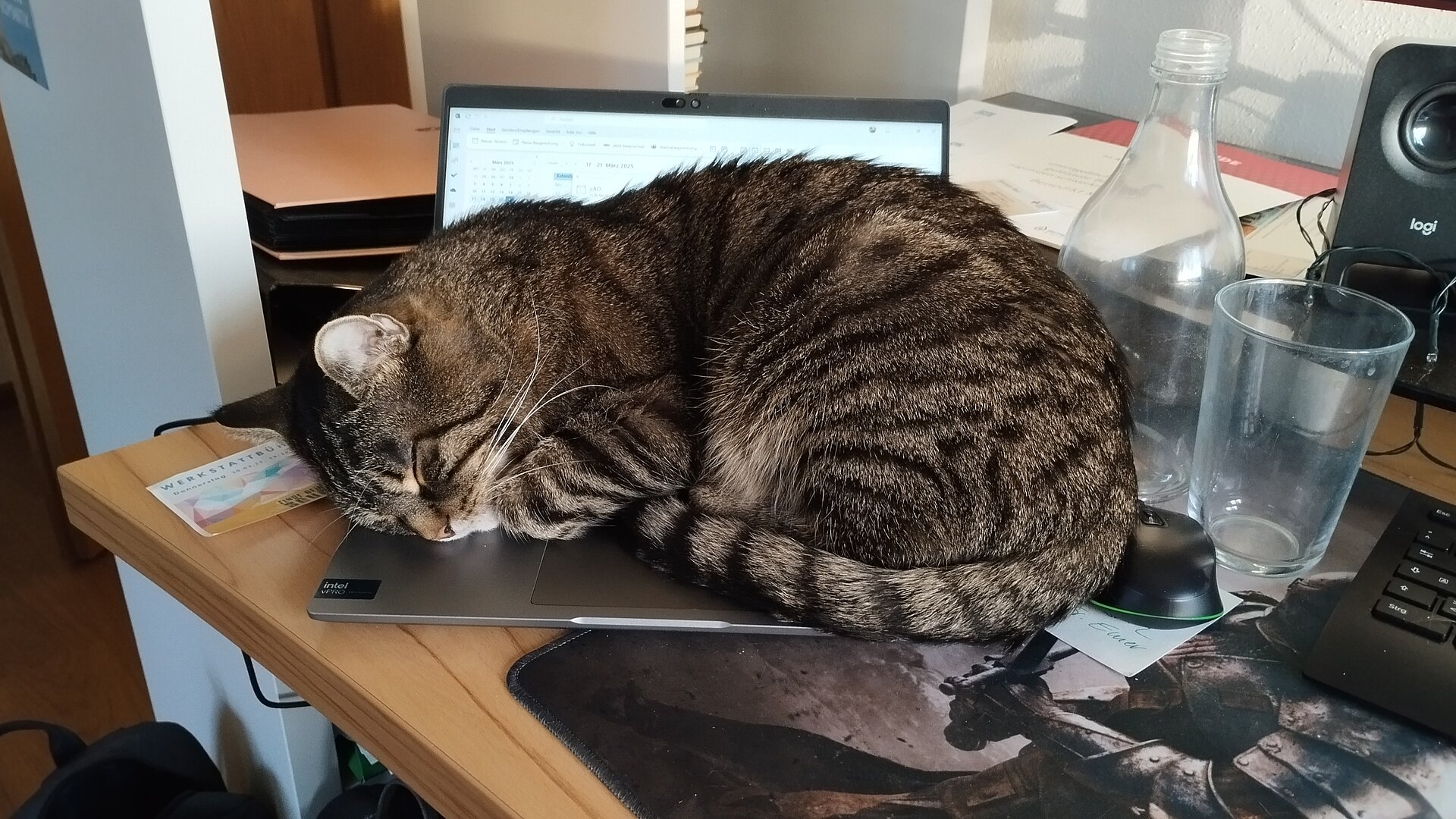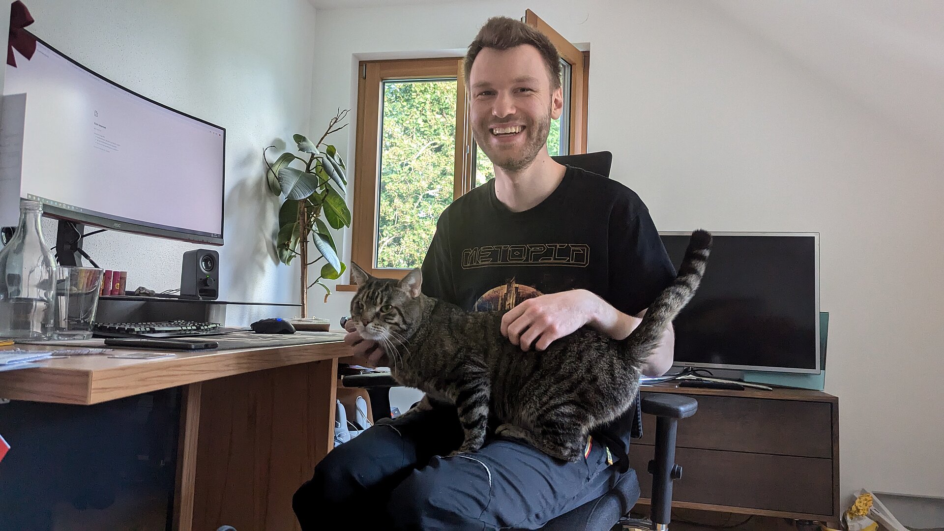 Dazu gönnt er sich Kuschelpausen mit der Katze, kleine Durchschnaufpausen und viel Trinken (sein go-to: Sprudel)